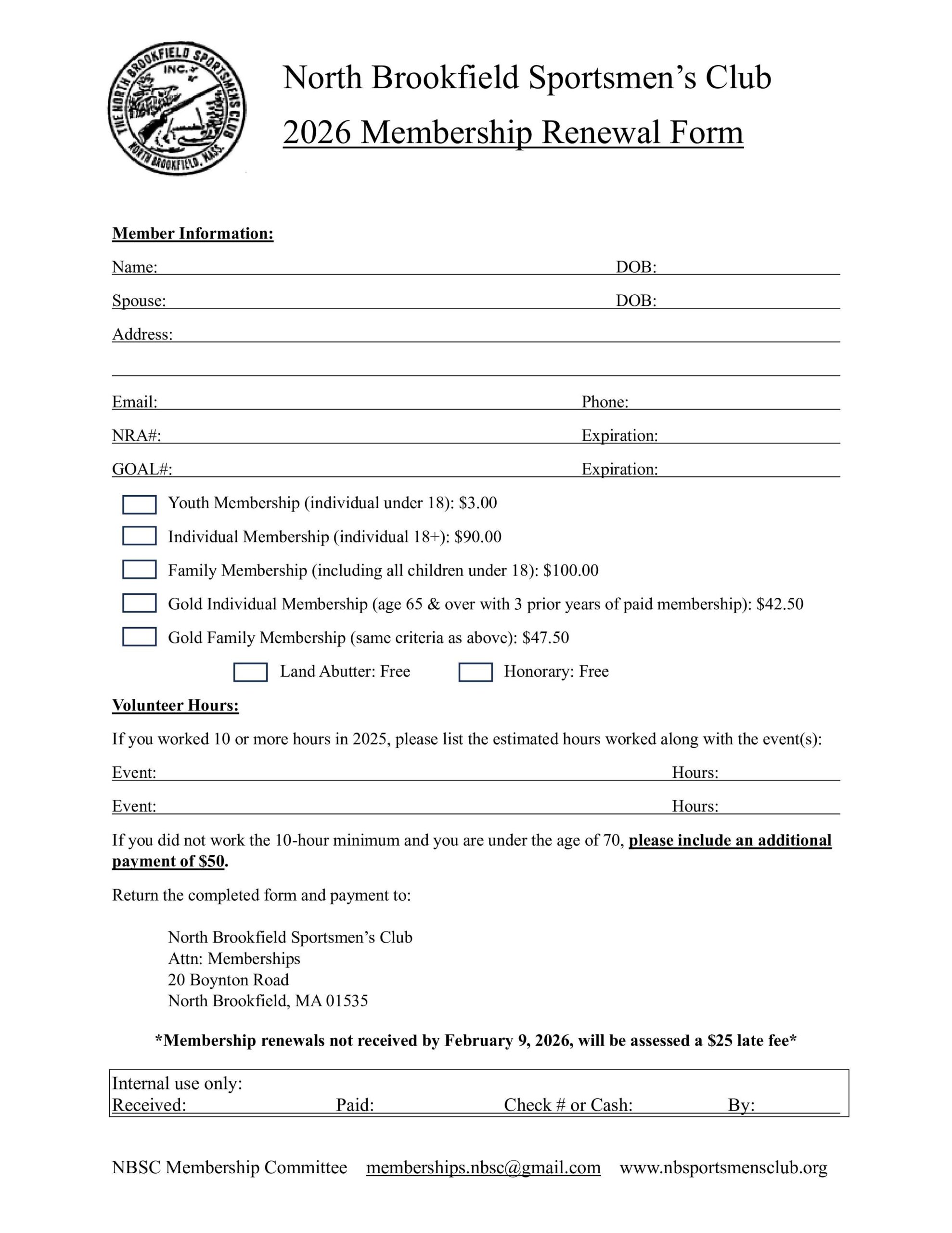 The North Brookfield Sportsmen’s Club is always looking for responsible individuals and families to become new members. For questions or more information use the contact info below.